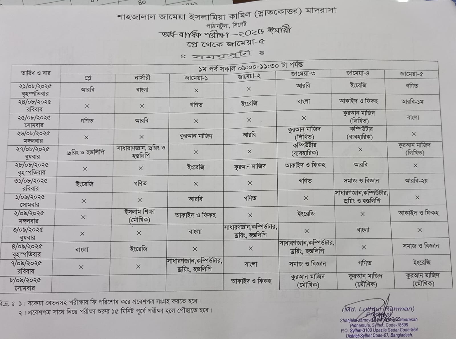 অর্ধবার্ষিক পরীক্ষা-২০২৫ এর সময়সূচী : সকাল পর্ব